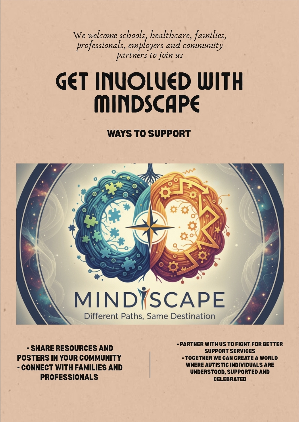 At Mindscape: Different Paths, Same Destination, we believe that true change begins at the community level. Our unwavering commitment to advocacy and support drives us to actively engage with local resources, fostering an inclusive environment where everyone can find their place. By facilitating open dialogues and educational initiatives, we strive to enlighten our community about neurodivergence. Understanding is the first step towards acceptance, and it is our mission to ensure that every individual’s voice is not only heard, but valued. We invite you to join us on this journey of compassion and understanding, as together we work to cultivate a community where diversity is celebrated and every person feels a profound sense of belonging. With your support, we can create pathways that lead to positive change in the lives of many.